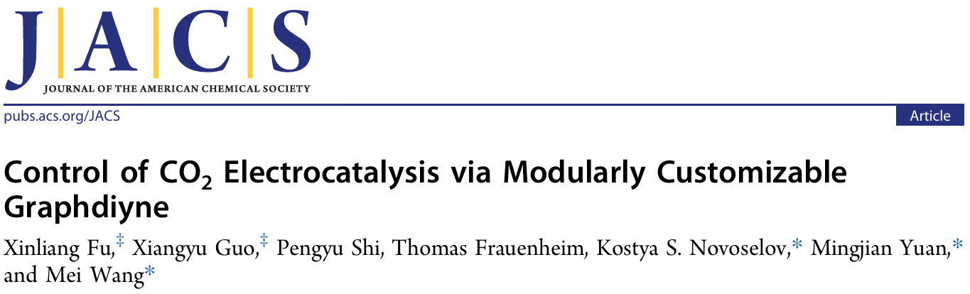 近日,国际权威期刊Journal of the American Chemical Society(《美国化学会志》)在线发表了物理化学教研室付信亮博士最新研究成果。论文题为“Control of CO2 Electrocatalysis via Modularly Customizable Graphdiyne”(通过模块化可定制石墨炔实现CO2电催化调控)。付信亮博士和德国不来梅大学郭翔宇博士为该论文共同第一作者,新加坡国立大学Kostya S. Novoselov教授、南开大学袁明鉴教授、天津理工大学王梅教授为共同通讯作者,太阳成集团为论文第二单位。Journal of the American Chemical Society创刊于1879年,是美国化学会的旗舰期刊、中科院一区top期刊及自然指数(Nature Index)收录期刊,致力于发表化学学科领域的原创性突破性研究成果,最新影响因子为15.6。