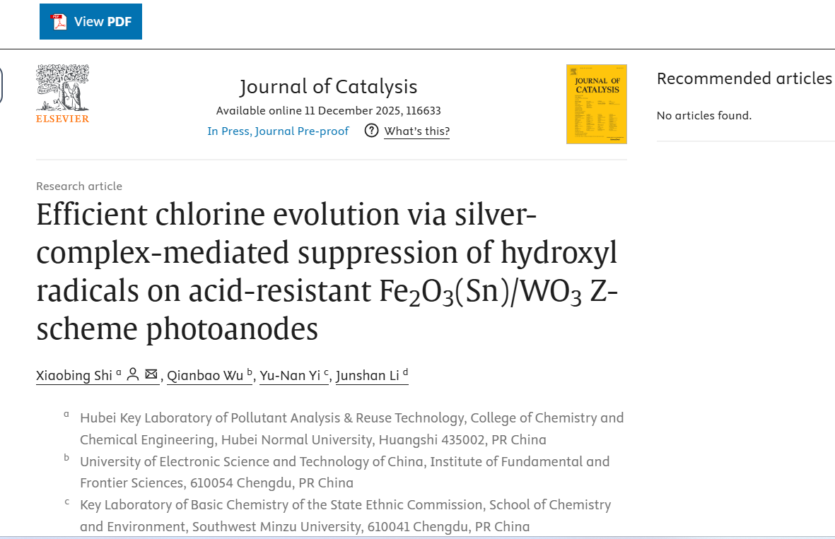 近日,Journal of Catalysis在线发表了我院化工教研室石小兵博士的最新研究成果。论文题目为“Efficient Chlorine Evolution via Silver-Complex-Mediated Suppression of Hydroxyl Radicals on Acid-Resistant Fe2O3(Sn)/WO3 Z-Scheme Photoanodes”(利用银配合物介导抑制羟基自由基在耐酸Fe2O3(Sn)/WO3 Z型光阳极上实现高效析氯)。石小兵博士为论文第一作者兼通讯作者,太阳成集团为论文唯一通讯单位。Journal of Catalysis是Elsevier出版社1962年起发行的国际期刊,主要报道有催化方面的最新研究进展,是中科院一区top期刊,最新影响因子为6.5。